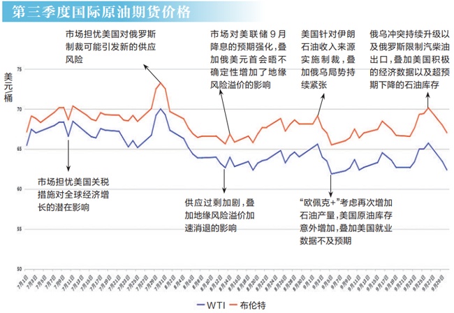 十月10日,受到美国威胁大幅提高关税、“欧佩克+”持续增产以及中东地区地缘政治风险溢价消退等因素的影响,WTI原油期货价格较前一个交易日下跌4.2%,达58.9美元/桶,布伦特原油期货价格较前一个交易日下跌3.8%,达62.73美元/桶。进入十月以来,国际油价接连下挫。而刚刚过去的第三季度,国际油价运行中枢上移。布伦特原油期货价格均价为68.17美元/桶,比第二季度均价上涨1.46美元/桶。